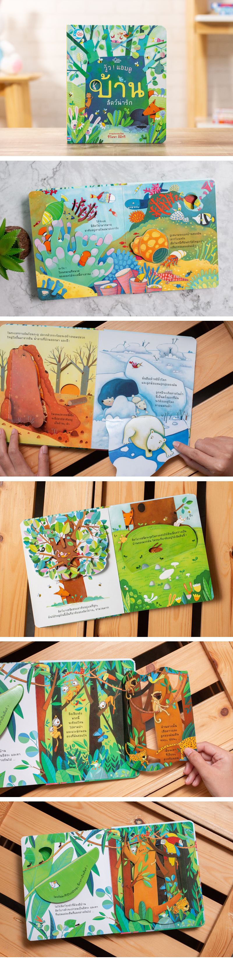 2. เป็น หนังสือแบบ Lift-the-flap ที่จะมีข้อความ และรูปภาพซ่อนอยู่ภายใต้แผ่นเปิดปิด ที่จะทำให้เด็กๆ และผู้ปกครองได้สนุกในการค้นหาไปด้วยกัน รวมทั้งช่องเจาะรูต่างๆ ที่จะสามารถส่องเห็นบรรดาสัตว์ที่ซ่อนอยู่ได้