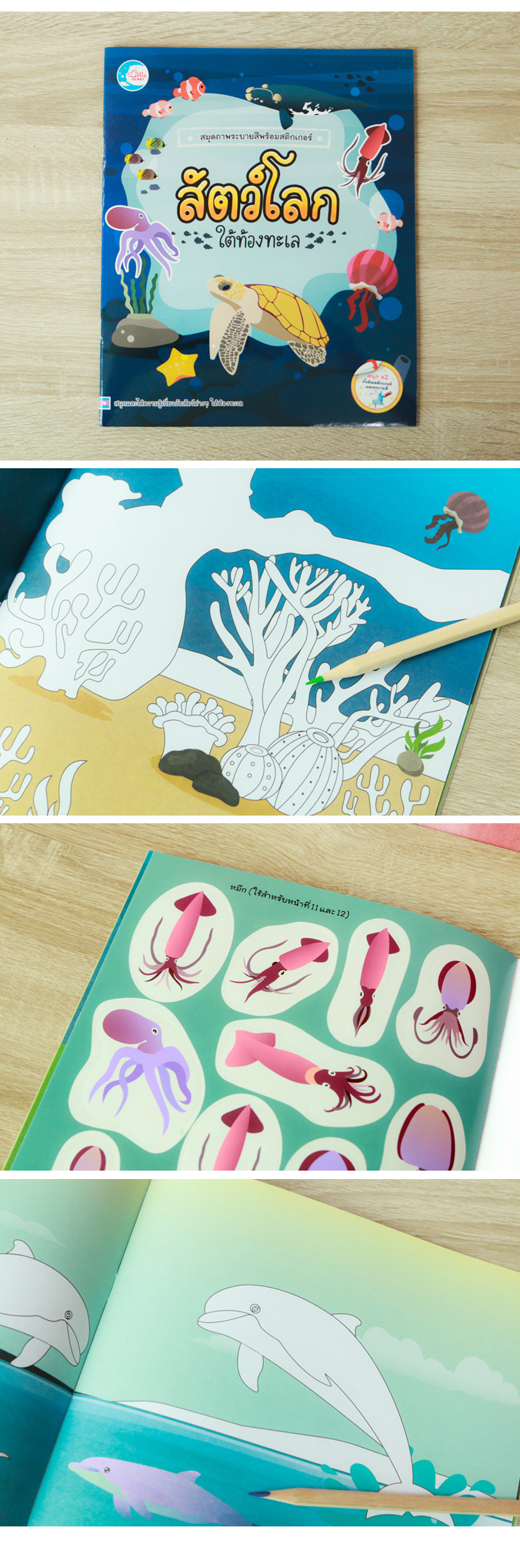 สมุดภาพระบายสีพร้อมสติกเกอร์ ชุด สัตว์โลกใต้ท้องทะเล เป็นเครื่องมือช่วยเสริมสร้างจินตนาการ และความคิดสร้างสรรค์ เด็กๆ จะได้ฝึกลากเส้น และรูปทรงต่างๆ จากการระบายสี ฝึกควบคุมกล้ามเนื้อ และประสานสัมพันธ์ระหว่างมือกับตา ได้เรียนรู้และรู้จักสัตว์ต่างๆ ใต้ท้องทะเล ผ่านตัวการ์ตูนสีสันสดใสน่ารัก