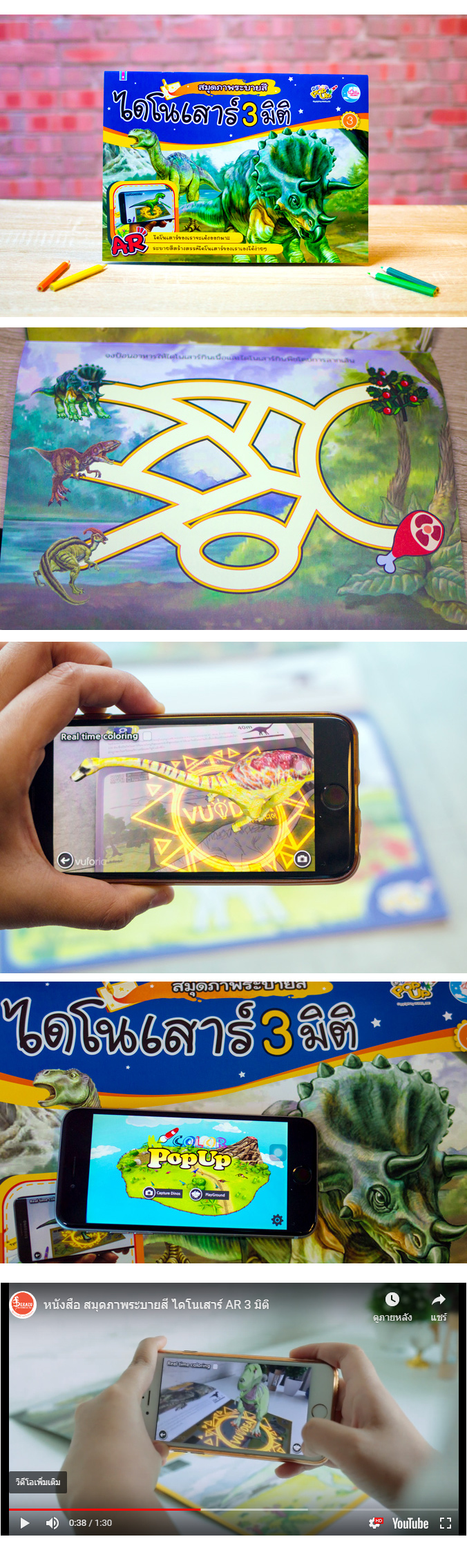 สมุดภาพระบายสีไดโนเสาร์แสนสนุกที่มาพร้อมกับแอพพลิเคชั่นเทคโนโลยีภาพเสมือนจริง เพียงนำแอพพลิเคชั่นส่องไปที่ไดโนเสาร์ซึ่งระบายสีเอาไว้เรียบร้อยแล้ว ไดโนเสาร์เสมือนจริงจะปรากฏขึ้นมาภายในหน้าจอสมาร์ทโฟนทันที