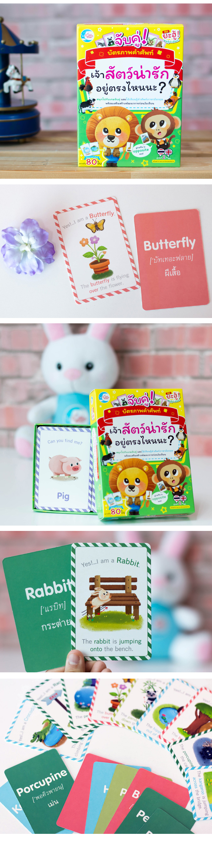 บัตรภาพคำศัพท์ จับคู่ Where is the animal? เจ้าสัตว์น่ารักอยู่ตรงไหนนะ? เด็กๆจะได้เรียนรู้จักตำแหน่งต่างๆจากสัตว์หลากหลายชนิด เป็นก้าวแรกของการเรียนรู้ที่ บัตรภาพคำศัพท์จับคู่จะช่วยพัฒนาทักษะสมองทั้งซึกซ้ายและขวาอย่างสมดุล ทำให้มีความพร้อมรอบด้านในการพัฒนาทักษะการเรียนรู้ต่างๆของเด็กได้เป็นอย่างดีและยังเสริมสร้างความสัมพันธ์ในครอบครัว เด็กๆจะได้เรียนรู้คำศัพท์ ทั้งภาษาไทย และภาษาอังกฤษ สนุกกับการจับคู่บัตรภาพคำศัพท์พร้อมกับโปสเตอร์สีสันใส น่ารัก น่าเรียนรู้