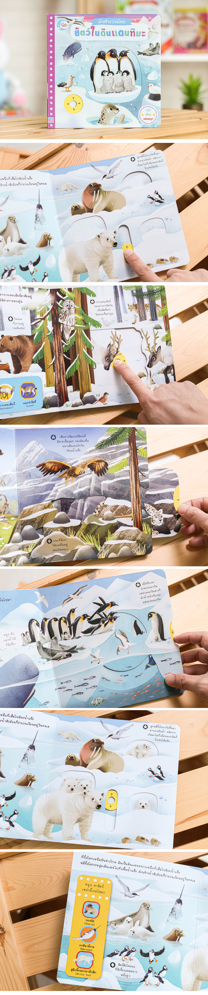 หนังสือกลไกบอร์ดบุ๊ค สามารถเลื่อนขยับภาพได้ เรื่องราวเกี่ยวกับสัตว์ทั้งหลายที่อาศัยในดินแดนหิมะ สนุก และได้ความรู้