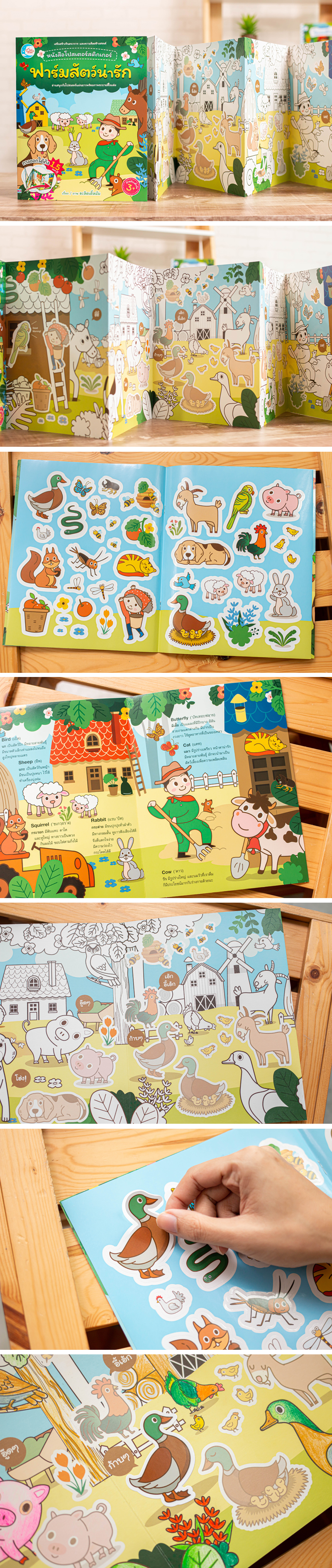 หนังสือที่มีความยาวถึง 1.5 เมตร ให้เด็กๆ ได้สนุกไปกับภาพประกอบอย่างต่อเนื่องและเรียนรู้เรื่องราวของสัตว์ในฟาร์มชนิดต่างๆ ว่าแต่ละตัวเรียกว่าอะไร และมีจุดเด่นหรือความสามารถพิเศษยังไง และด้านหลังจะมีพื้นที่ให้เด็กๆ ได้ระบายสีและติดสติกเกอร์ ช่วยฝึกและกระตุ้นพัฒนาการเด็กได้รอบด้าน