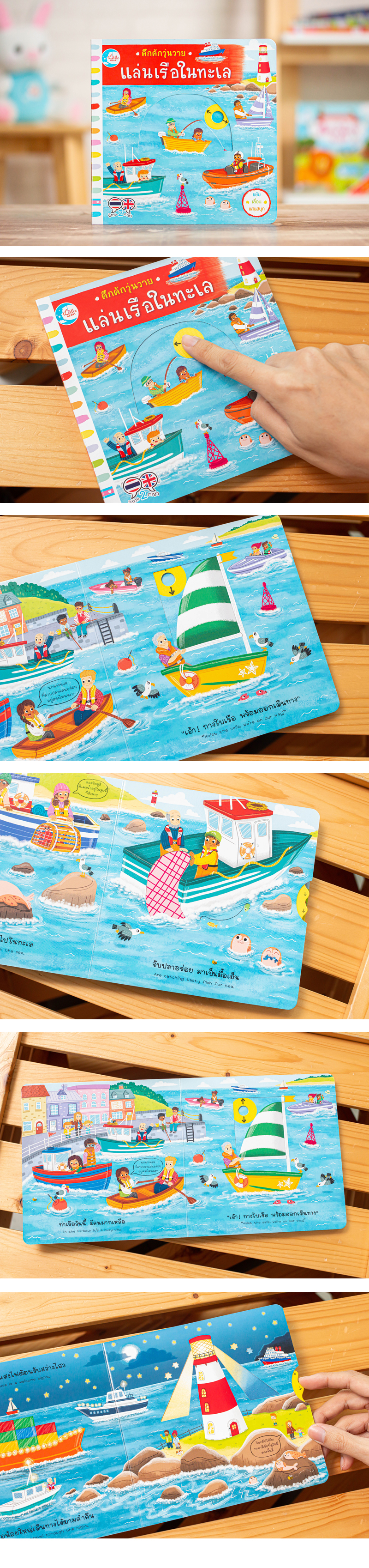 พาเด็กๆ ไปสนุกกับการแล่นเรือชนิดต่างๆ ออกสู่ท้องทะเลสีฟ้าสดใสกันเถอะ ไม่ว่าจะเป็นเรือลำเล็กที่แข็งแรง เรือลำใหญ่ที่บรรทุกของได้เยอะมาก มาสนุกกับการขยับ เลื่อน หมุนกลไก เพื่อสนุกไปกับการแล่นเรือออกสู่ทะเลกว้างกันเถอะ 1. เป็นหนังสือแบบมีกลไกดึง หมุน ดัน เลื่อน เพื่อให้เด็กๆ ได้ฝึกใช้กล้ามเนื้อมัดเล็ก และเพิ่มความสนุกสนานระหว่างเล่าเรื่อง 2. ภาพประกอบสวยงามเป็นพิเศษจากนักวาดที่มีฝีมือ 3. เด็กๆ ได้สนุกไปกับการแล่นเรือออกสู่ทะเลกว้าง ความสนุกขอกิจกรรมต่างๆ ในระหว่างแล่นเรือ 4. ผลิตจากวัสดุแข็งแรงไม่ฉีกขาดได้ง่าย