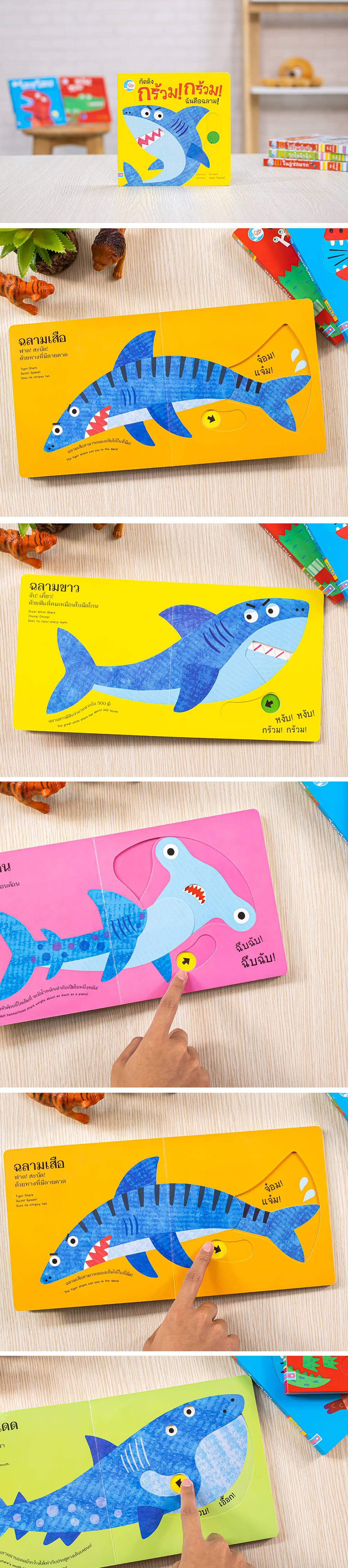 หนังสือจับขยับแสนสนุก ให้เด็กๆ ได้สนุกไปกับการจับสัตว์ทะเลอ้าปากงับๆ พร้อมเรื่องราวของฉลามและสัตว์ทะเลชนิดนั้นๆ
