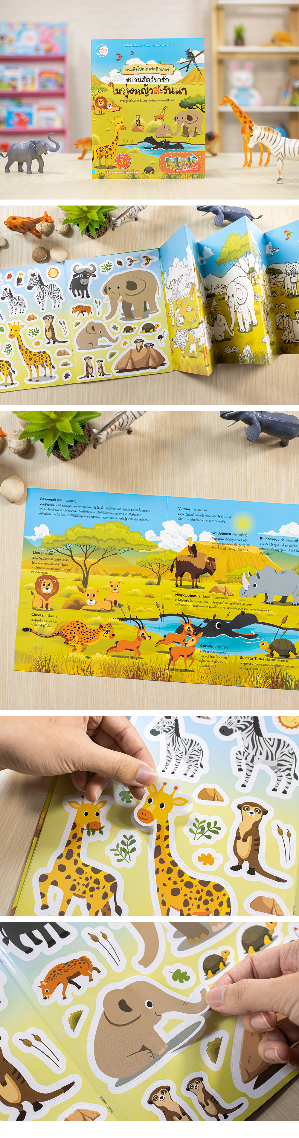 หนังสือที่มีความยาวถึง 1.5 เมตร ให้เด็กๆ ได้สนุกไปกับภาพประกอบอย่างต่อเนื่องและเรียนรู้เรื่องราวของสัตว์นานาชนิดในทุ่งหญ้าสะวันนา ว่ามีสัตว์ชนิดใดบ้างอาศัยอยู่บ้าง แต่ละตัวเรียกว่าอะไร และมีจุดเด่นหรือความสามารถพิเศษยังไง และด้านหลังจะมีพื้นที่ให้เด็กๆ ได้ระบายสีและติดสติกเกอร์ ช่วยฝึกและกระตุ้นพัฒนาการเด็กได้รอบด้าน