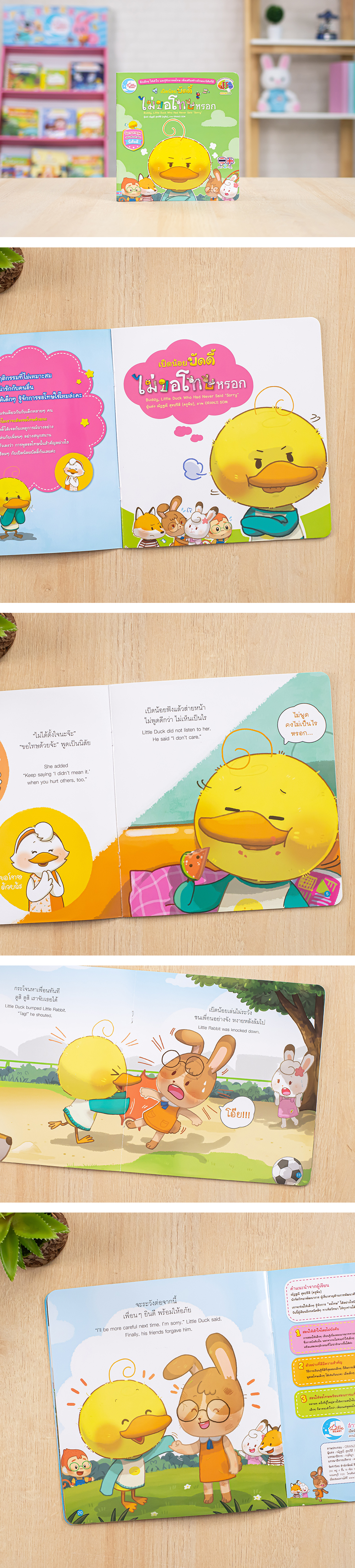 นิทานภาพสุดน่ารักของเจ้าเป็ดน้อยบัดดี้ ที่จะทำให้เด็กๆ ได้เรียนรู้และเข้าใจ พฤติกรรมหรือลักษณะนิสัยที่ดี ซึ่งเป็นพัฒนาการของสมองส่วนหน้า Executive Function หรือ EF ที่สามารถฝึกและส่งเสริมให้กับลูกน้อยให้เข้าใจว่าการพูดขอโทษนั้น สำคัญอย่างไร เมื่อเกิดเหตุกาณ์ที่ทำให้ผู้อื่นบาดเจ็บ ด้วยความไม่ตั้งใจ เด็กๆ จะได้เรียนรู้อย่างสนุกผ่านตัวละครที่สดใสน่ารักชวนให้น่าอ่าน เหมาะสำหรับให้คุณแม่คุณพ่ออ่านให้ฟังอย่างสนุกสนานด้วยกันในทุกๆ วัน